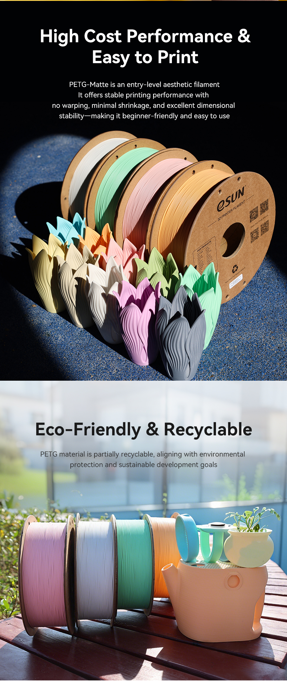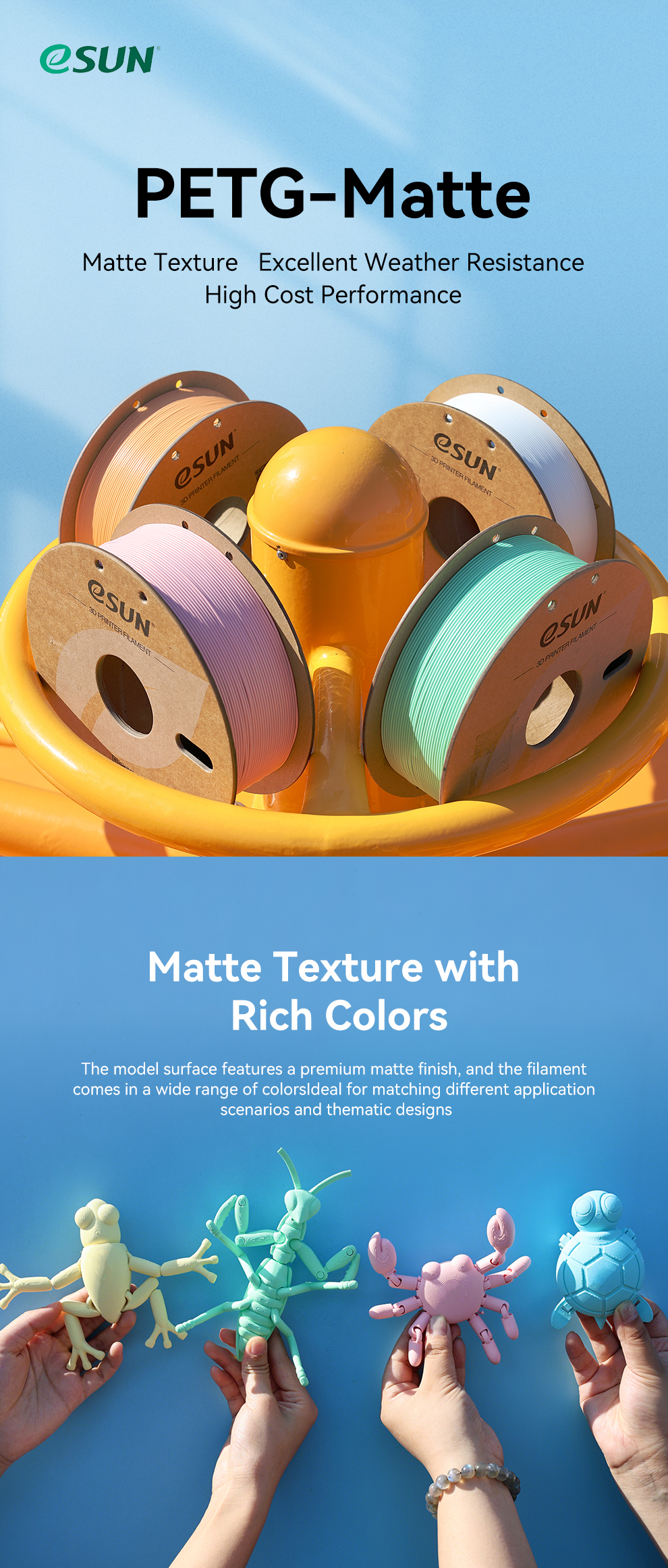 eSUN PETG-Matte is a modified PETG filament designed to combine the strength and durability of PETG with a smooth matte surface finish. It offers improved printability, reduced gloss, and a premium look for functional and aesthetic prints.