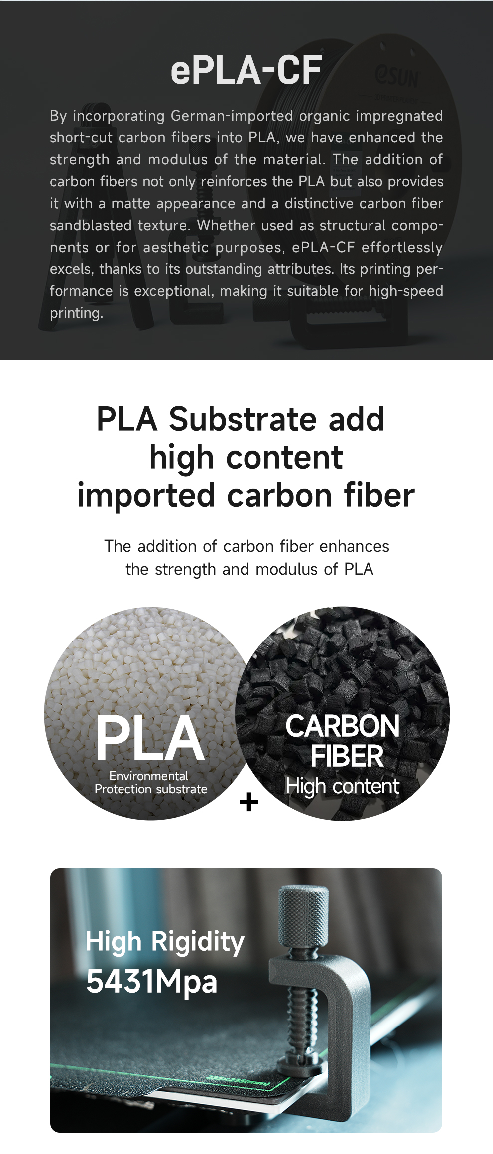 eSUN PLA-CF is a carbon fiber reinforced PLA filament designed for improved strength, rigidity, and a premium matte finish. It combines the ease of PLA printing with enhanced mechanical performance, making it suitable for functional and aesthetic applications.