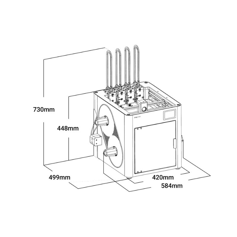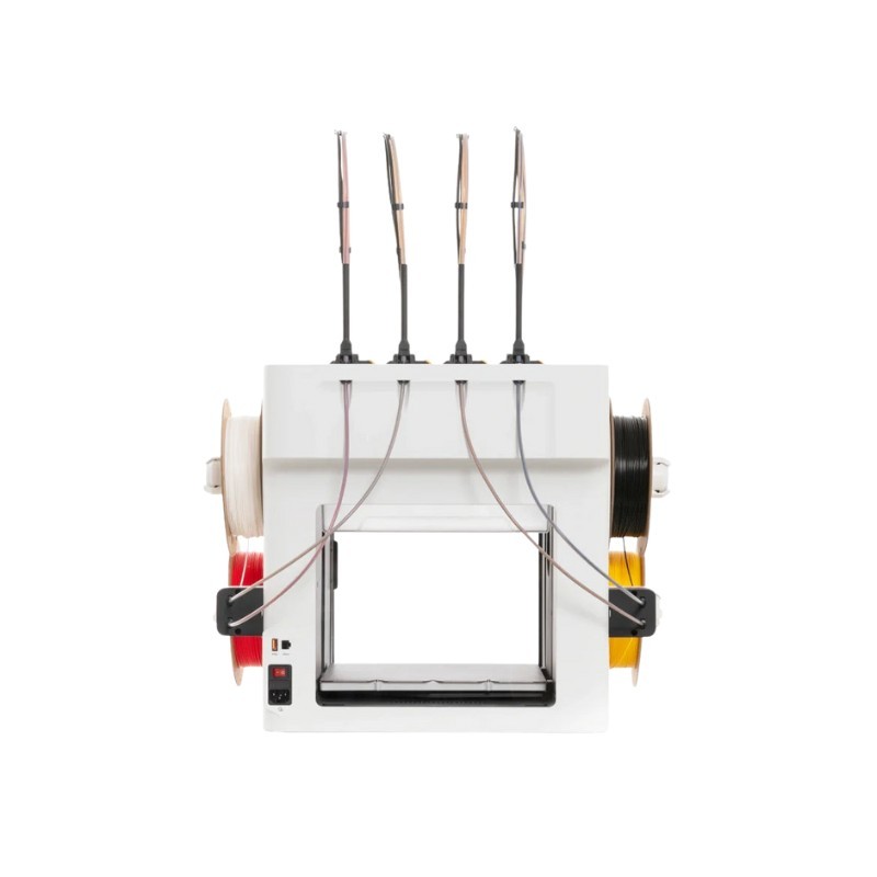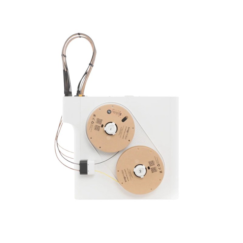 Holds up to four spools with RFID recognition, auto-feeding, backup switching, and filament waste collection.