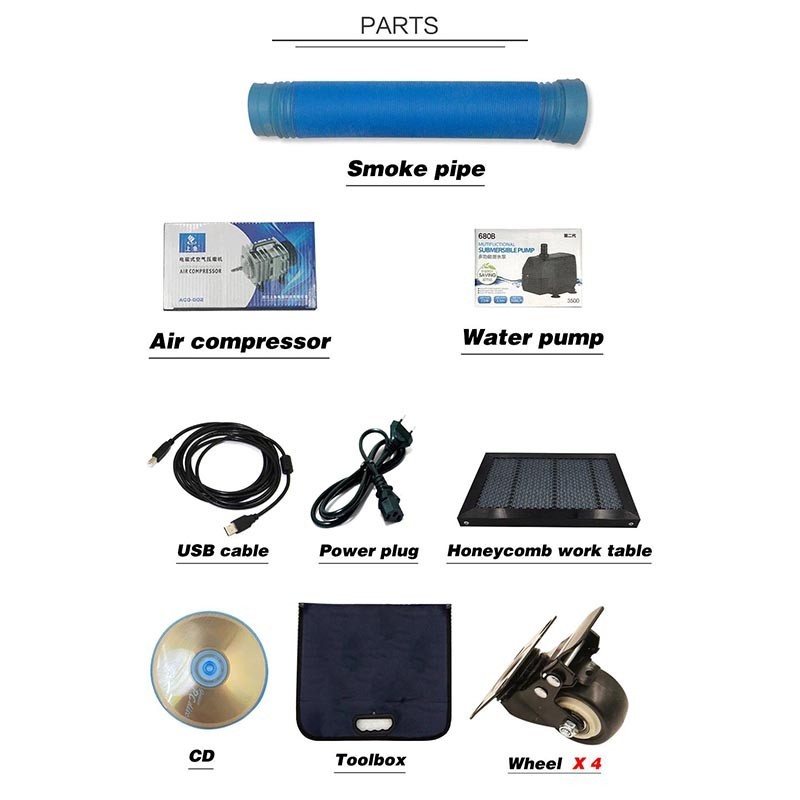 Free accessories | Air Compressor/Water Pump/Air Pipe/Water Pipe/Software and Dongle/ English User Manual/USB Cable/Power Cable |