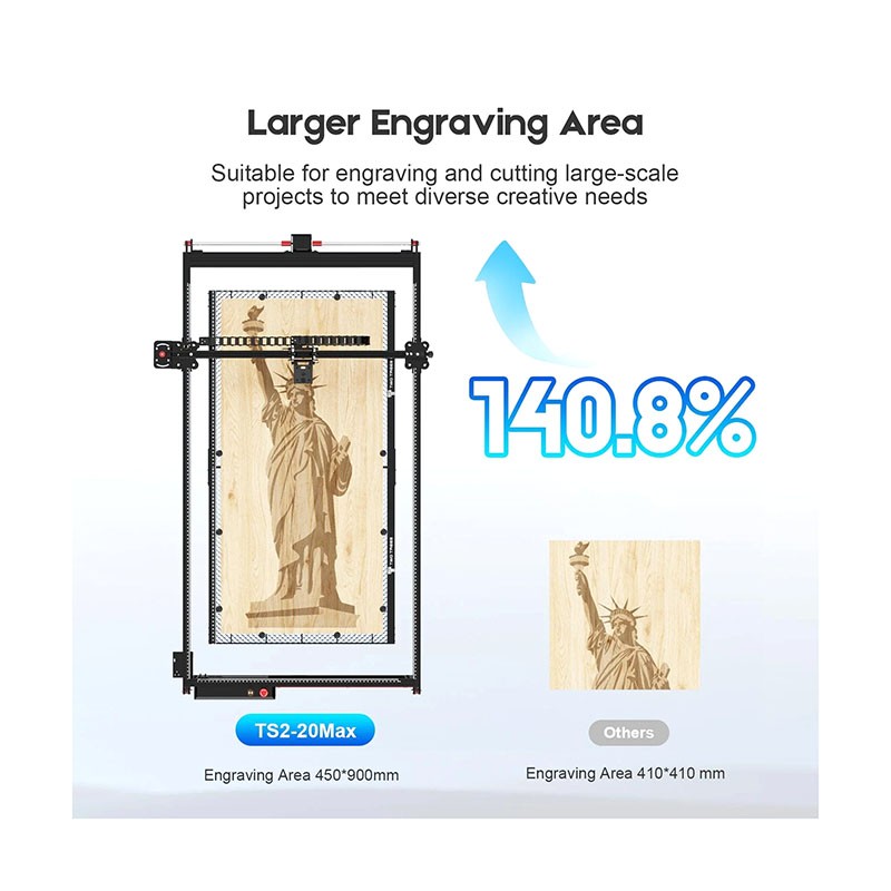 The TS2-20Max is a high-performance laser engraving and cutting machine designed for creators, professionals, and small workshops. With a generous 450 × 900 mm working area and 20W laser output, it offers excellent material compatibility and fast engraving speeds – perfect for demanding tasks involving wood, acrylic, leather, and more.