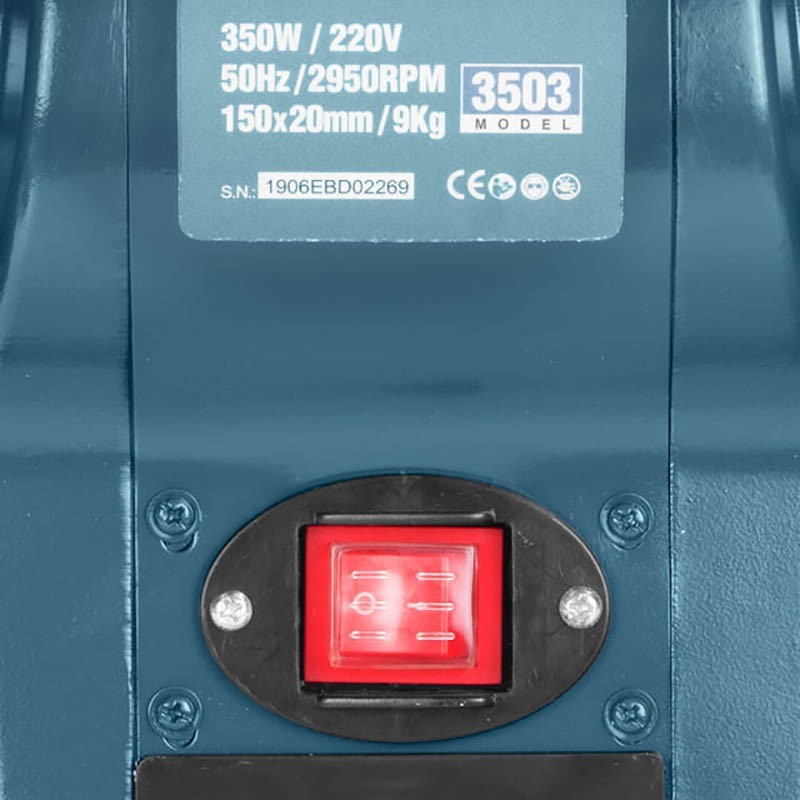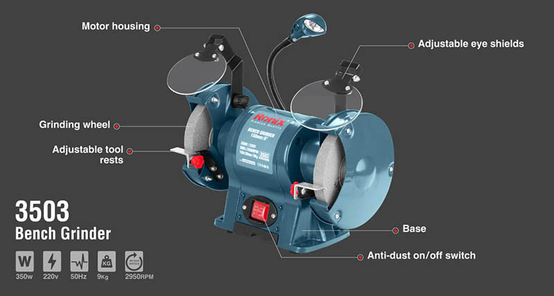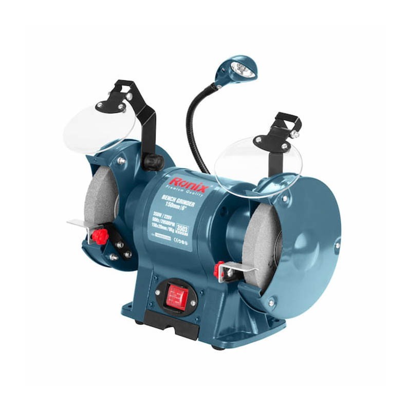 Ronix 3503 Bench Grinder, 350W, 6*150*16mm has a 350W powerful induction motor. This high-efficient motor provides high power for all kind of sanding, polishing, finishing, buffing, carving and etc. in many different industries and jobs such as woodworking and carpentry workshops, metal fabrication shops, furniture manufacturing. 2950RPM high-speed rotation is the result of this fully functional motor which is proved to be perfectly suitable for industrial grinding applications. Safety first. Ronix has designed the safest power tools in the market so far. Ronix 3503 Bench Grinder is equipped with adjustable safety eye shield and spark resistors to avoid any eye and hand injury when using the slow-speed grinding mode. Eye shield is a safety element that is positioned directly above the grinding wheel to ensure that scraps do not come into contact with your face or eyes is this shield. When operating with your bench grinder, though, operator must still wear eye protection.