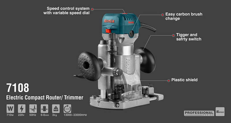 Ronix 7108 Electric Router is all you will need in your woodwork process! This 710W powerful tool with its 6mm-8mm collet size is ready to do perfect bit plunging, edge formatting, slot cutting and laminate trimming. This wonderful power tool is a 3kg, lightweight tool which has a variable speed setting from 13000 to 33000RPM. You can use it for different applications by only adjusting the depth using the adjustment mechanism, three-level stop and steel springs.