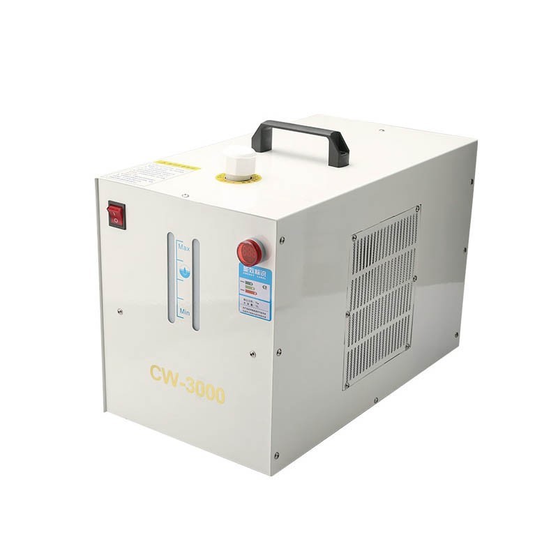 The CW3000 is a compact, economical water chiller designed for small laser engraving and cutting machines. It uses a fan-cooled radiator system without a compressor, making it suitable for light-duty applications and intermittent laser operation.
