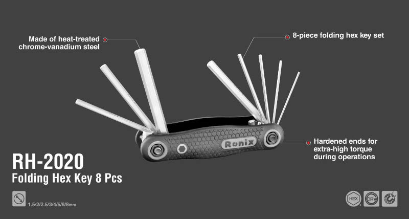 This small set of common, popular and smaller hex keys is ready to finish all your screwing tasks. You can have your 1.5mm, 2mm, 2.5mm, 3mm, 4mm, 5mm, 6mm and 8mm hex keys in your toolbox and keep bolts and screws fastened or loosened as quickly as possible. This wonderfully useful set is made of heat-treated chrome vanadium steel for rugged strength and more durability. You can always have the size that you need at hand because of the high-quality fold-up handle which leads to the firm holding of each key. This set of popular sizes is held together in one convenient handle and can fold out to a right angle for maximum leverage or out straight for a screwdriver style. The hardened end of these hex has extra-high torque during operations and will help you meet your deadlines. The hex ends are square-cut for a secure full-depth fit and maximum contact with the hex socket to prevent slippage and stripping of the socket. The ergonomic ABS plastic shell design of this set will also ensure comfort, slip resistance and safety. This set is the best you can have.
